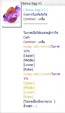 Bonus Egg V1 มีโอกาสได้ Costume Normal 10 % และ Costume Limited 1%